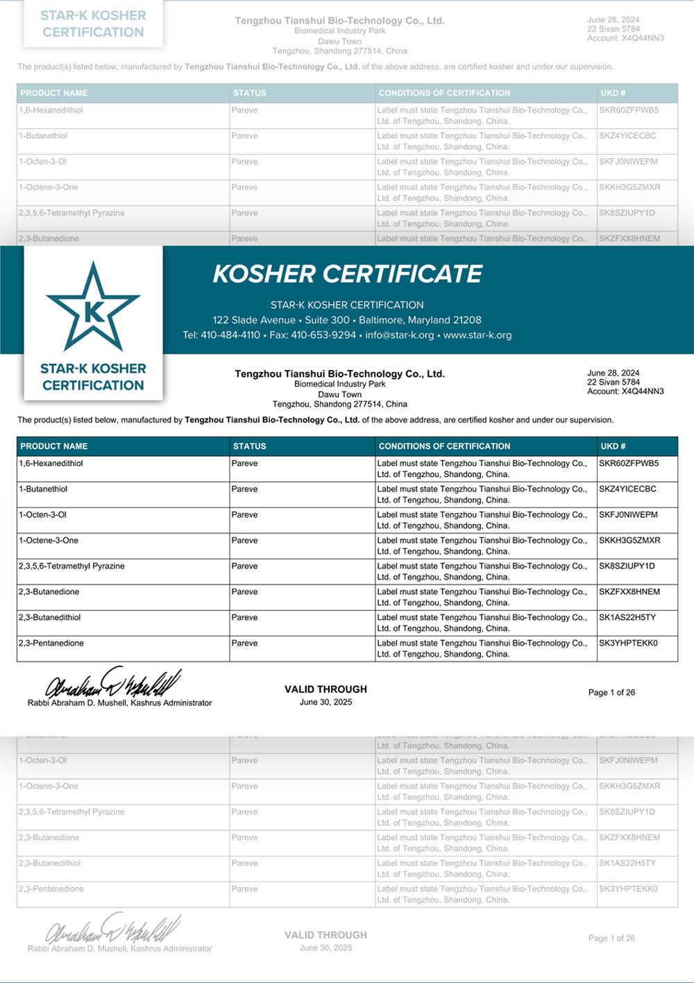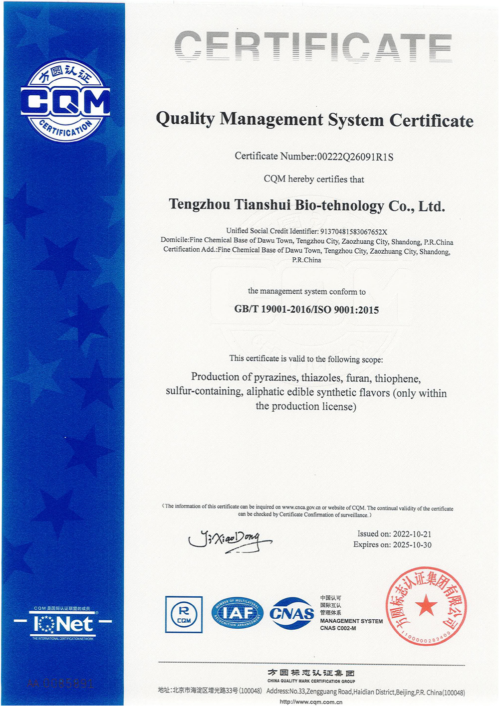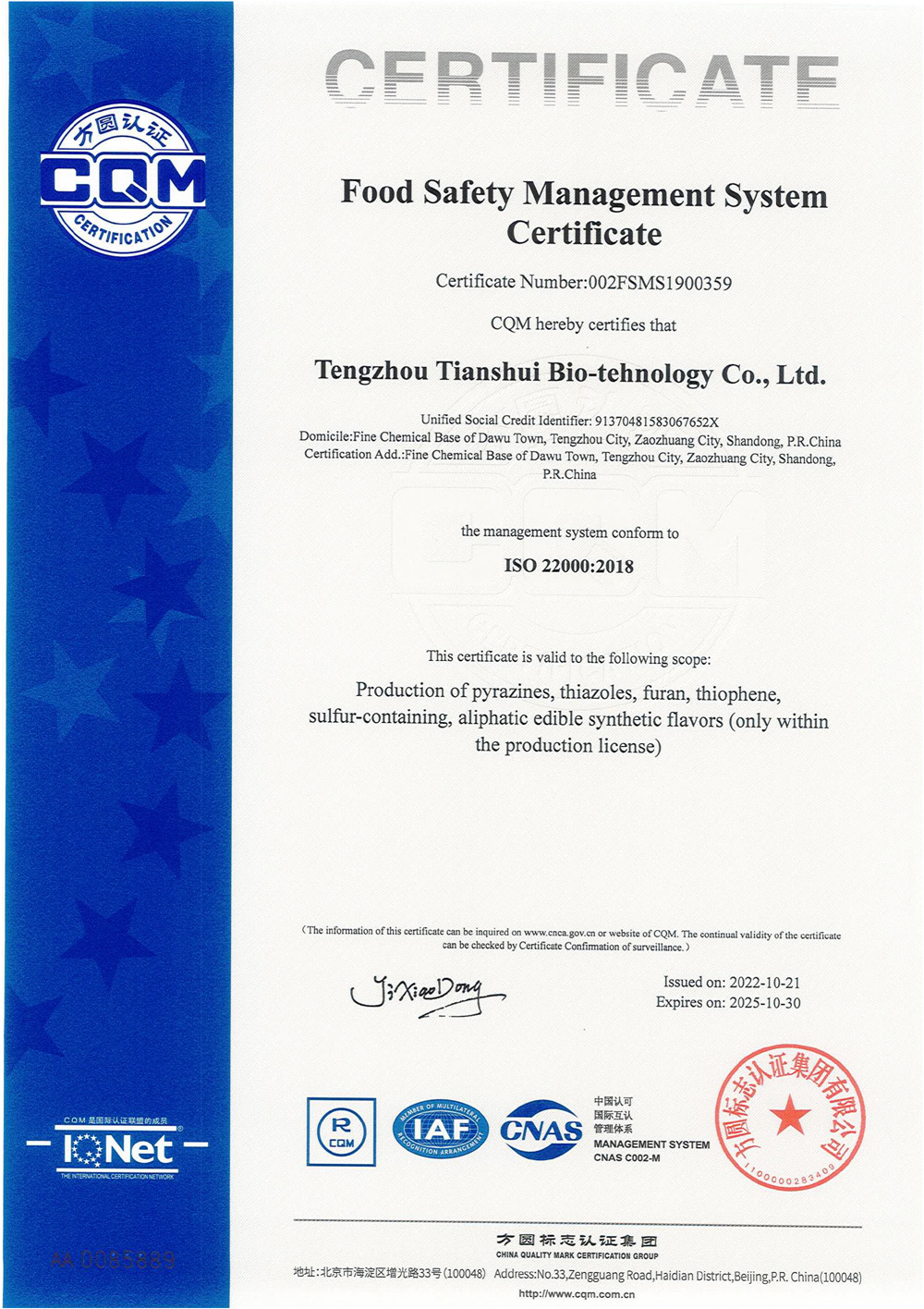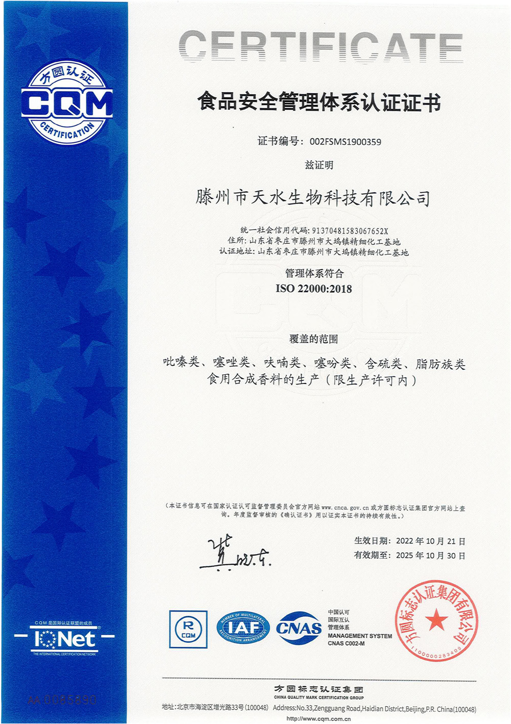 滕州市天水生物科技有限公司成立于2011年9月,是目前國(guó)內(nèi)雜環(huán)類合成食品香料、日化香料和醫(yī)藥中間體生產(chǎn)經(jīng)營(yíng)的綜合性企業(yè)。坐落于山東省滕州市生物醫(yī)藥產(chǎn)業(yè)基地,總投資5000余萬(wàn)元,占地面積約30000平方米,員工百余人。公司先后被評(píng)為高新技術(shù)企業(yè)、專精特新中小企業(yè)、科技型中小企業(yè),建有市級(jí)重點(diǎn)實(shí)驗(yàn)室1處,并先后獲得ISO9001質(zhì)量體系認(rèn)證、ISO22000食品安全體系認(rèn)證、kosher認(rèn)證和Halal認(rèn)證。是香精香料及食品配料協(xié)會(huì)會(huì)員單位及滕州市中小企業(yè)協(xié)會(huì)理事單位。